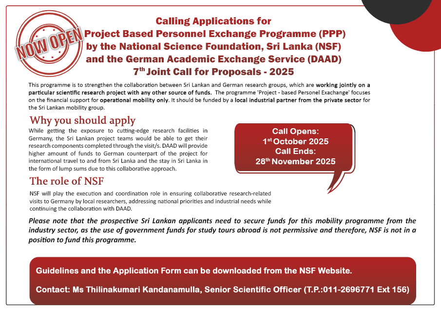 Coming Soon ...! Project Based Personnel Exchange Programme (PPP) by the National Science Foundation, Sri Lanka (NSF) and the German Academic Exchange Service (DAAD) - 7th Joint Call for Proposals - 2025